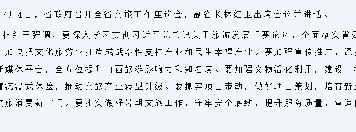 7月4日,省政府召开全省文旅工作座谈会,副省长林红玉出席会议并讲话。 林红玉强调,要深入学习贯彻习近平总书记关于旅游发展重要论述,全面落实省委省政府部署要求,加快把文化旅游业打造成战略性支柱产业和民生幸福产业。要加强宣传推广,深挖特色资源,用好新媒体平台,全方位提升山西旅游影响力和知名度。要加强文物活化利用,建设一批数字化景区,丰富沉浸式体验,推动文旅产业转型升级。要抓实项目带动,做好项目策划,培育新业态新场景,拓展文旅消费新空间。要扎实做好暑期文旅工作,守牢安全底线,提升服务质量,营造良好旅游环境