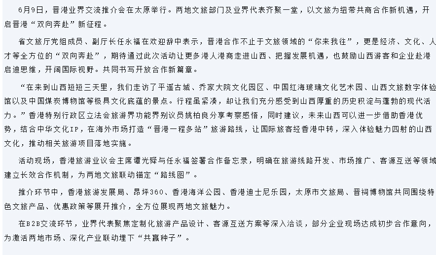 6月9日,晋港业界交流推介会在太原举行。两地文旅部门及业界代表齐聚一堂,以文旅为纽带共商合作新机遇,开启晋港“双向奔赴”新征程。 省文旅厅党组成员、副厅长任永福在欢迎辞中表示,晋港合作不止于文旅领域的“你来我往”,更是经济、文化、人才等全方位的“双向奔赴”,期待通过此次活动让更多港人港商走进山西、把握发展机遇,也鼓励山西游客和企业赴港启迪思维,开阔国际视野。共同书写开放合作新篇章。